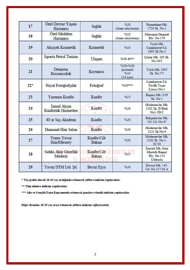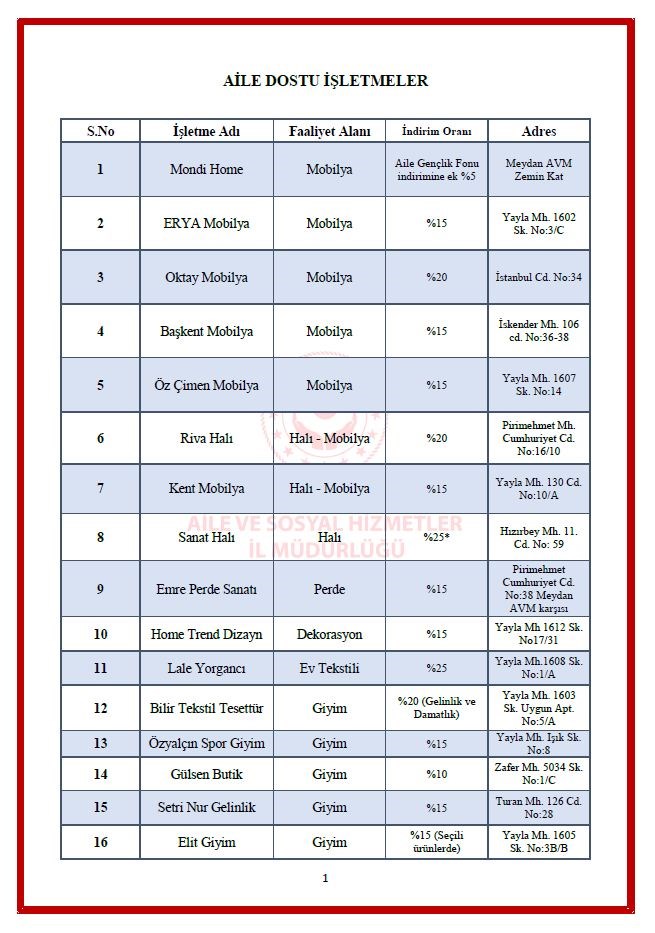 10 Ekim 2025Bilindiği üzere, Cumhurbaşkanlığımız himayesinde ve Aile ve Sosyal Hizmetler Bakanlığı koordinasyonunda ailenin öneminin vurgulanması, aile içindeki birlik ve beraberliğin korunması, mevcut riskler karşısında ailenin topyekûn desteklenmesi amacıyla 2025 yılı Aile Yılı olarak ilan edilmiştir. Bu kapsamda Aile Yılına ilişkin ilimizde yaşayan tüm aileleri kapsayacak şekilde ailelere ekonomik fayda sağlayacak (indirim, hediye çeki vb.) faaliyetler gerçekleştirilmesi Aile Sosyal Hizmetler İl Müdürlüğü tarafından talep edilmiş ve yine aynı müdürlük tarafından ilimizde ailelere yönelik ekonomik fayda sağlaması amacıyla indirim anlaşmaları gerçekleştirilen çeşitli firmaların listesi sunulmaktadır.